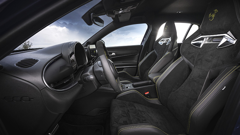 S vonkajším dizajnom nového modelu Abarth 600e korešponduje športovo ladený interiér, ktorí dizajnéri Abarth navrhli s veľkou pozornosťou venovanou detailom. Športový dvojramenný volant má ergonomicky tvarovaný veniec potiahnutý kombináciou perforovanej kože a alcantary. Stĺpiky karosérie majú čierne obloženie, ktoré spolu s čiernym stropom kabíny a obkladmi dverí dotvára športové ladenie interiéru. Čiernu tému dizajnu akcentujú farebné kontrastné detaily ako logo škorpióna na volante, prešívanie venca volantu